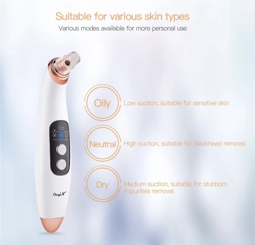 Designed for a variety of skin types. Use vacuum absorption technique from level 1 to level 5 suction forces, level 1 is for sensitive and dry skin, level 2-3 are for neutral skin, level 4-5 are for mixed and oily skin.